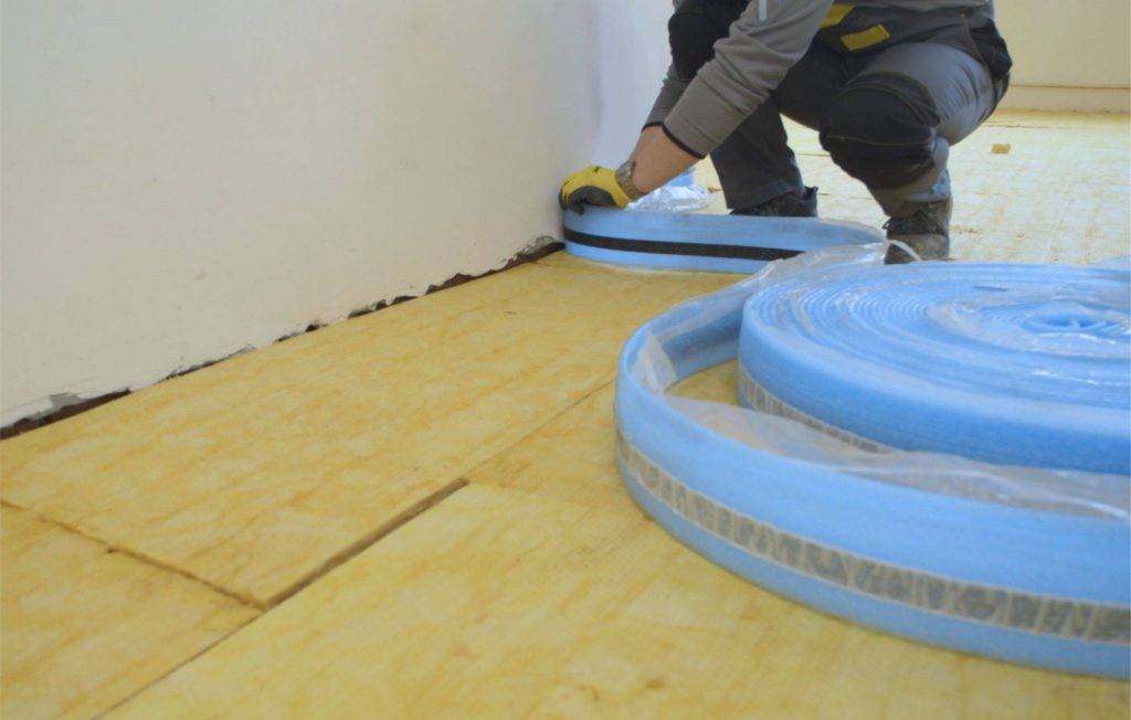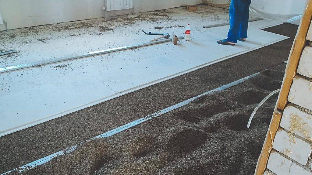 Учитывая, что сухая засыпка отличается от устройства цементно-песчаной смеси постоянством агрегатного состояния и разными прочностными свойствами, перед её устройством необходимо обеспечить компенсационную прослойку в местах примыкания к стене. Этот процесс осуществляется с помощью пористой полимерной ленты, которая продаётся в каждом строительном магазине в рулонах. Ширина ленты должна быть не менее толщины пирога будущего пола. Для фиксации ленты можно применить клеевые составы, монтажную пену и жидкие гвозди, но она также может быть зафиксирована слоем засыпки, устроенного по периметру стены.