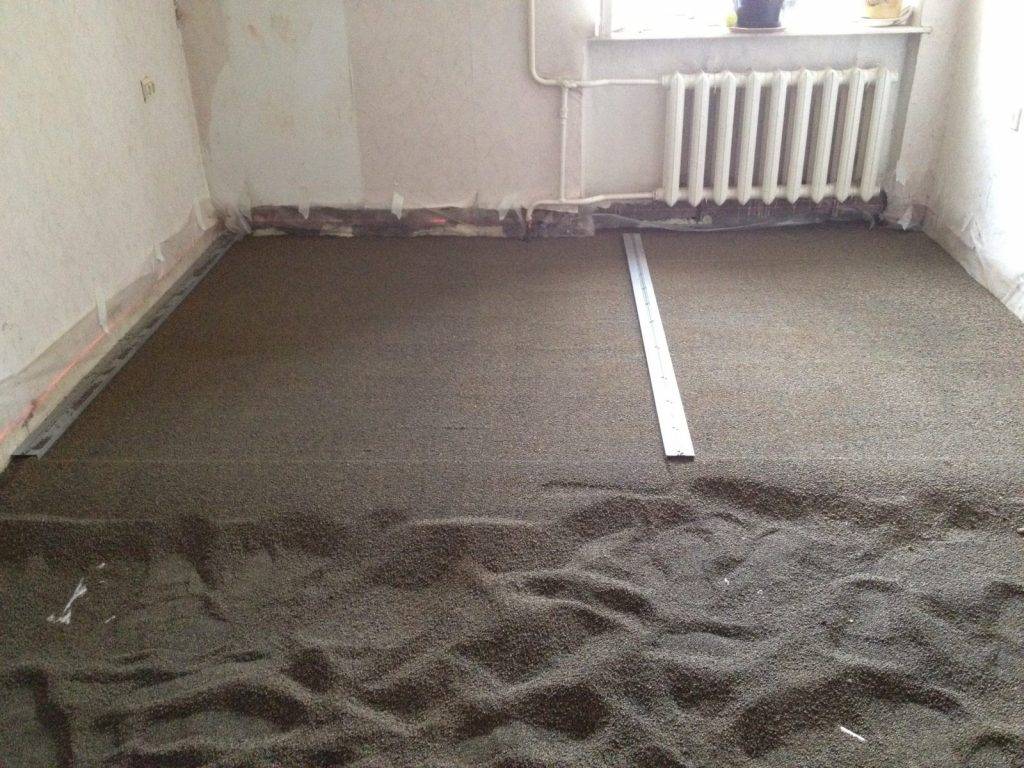 Когда маяки смонтированы, пространство между ними засыпается сыпучим материалом так, чтобы верхняя отметка материала была на 10 – 20 мм выше, чем проектный уровень поверхности стяжки. Это связано с тем, что, при выравнивании поверхности, материал уплотняется и даёт осадку, что позволит привести поверхность в нужный уровень.