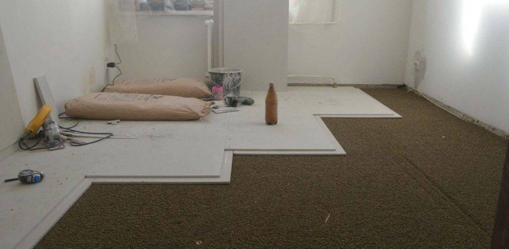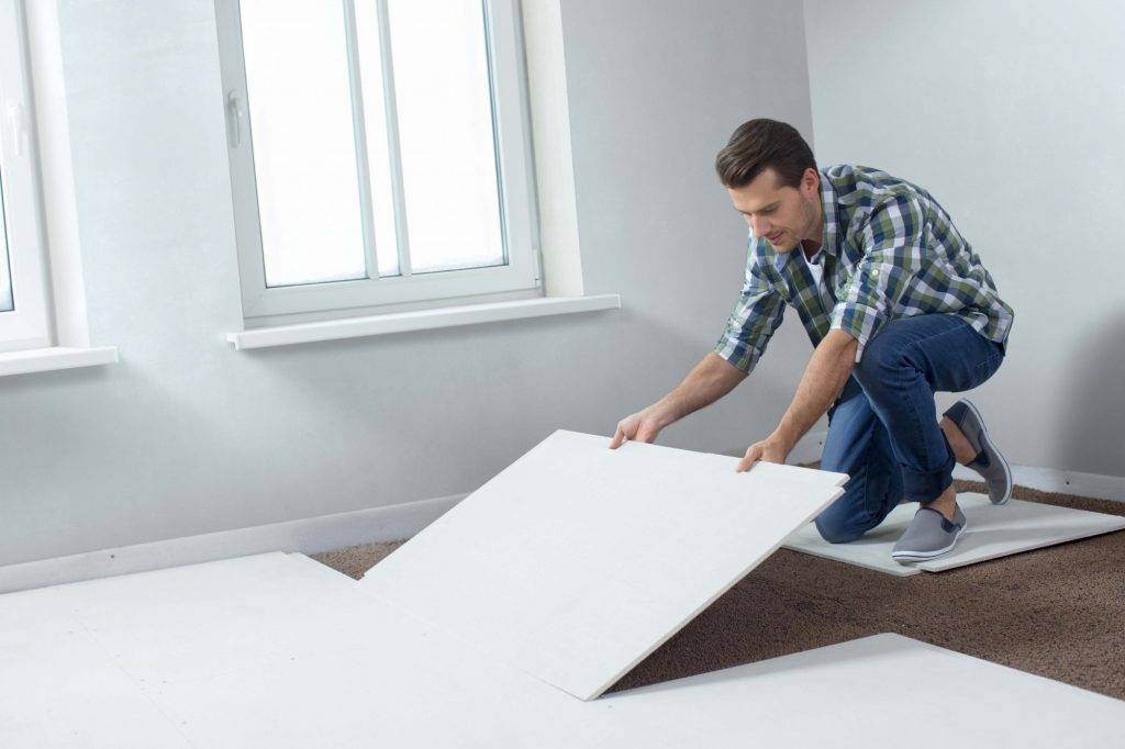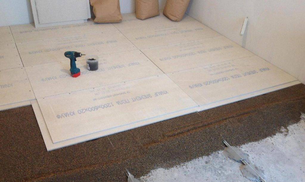 Когда плоскость выровнена на всей площади комнаты, начинается укладка жёстких распределительных плит. Для этих целей подойдут асбоцементные листы, но лучшим решением считается специальный материал «элемент пола», который производится и представлен на рынке компанией Knauf. Отличительная особенность данных деталей, помимо повышенной прочности и идеально ровной поверхности, состоит в том, что каждый лист имеет обработанную кромку, что позволяет обеспечить надёжное сопряжение элементов между собой.