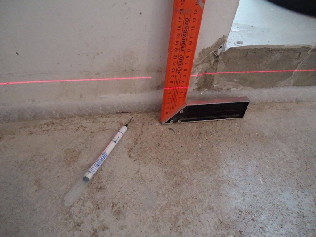 Из наименьшей величины вычитаем толщину стяжки и получившуюся длину отмеряем вниз от прочерченного ранее уровня. После соединения всех вновь отмеченных меток получится нулевой уровень для всех помещений. Это уровень до которого будет заливаться будущая стяжка.