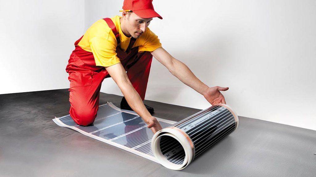 Пленочные электрополы универсальны под любой финишной отделкой. Владелец может выбрать кафель, панели из ламината или винила. Потребитель покупает полы в виде матов, внутри которых есть нагревательный элемент – провод. Тепло излучается вверх. Строго перпендикулярно поверхности размещения. Также пленка может быть прикреплена к изнанке ковра, есть терморегулятор, который дает преимущество в виде отключения тепла в жаркое время года.