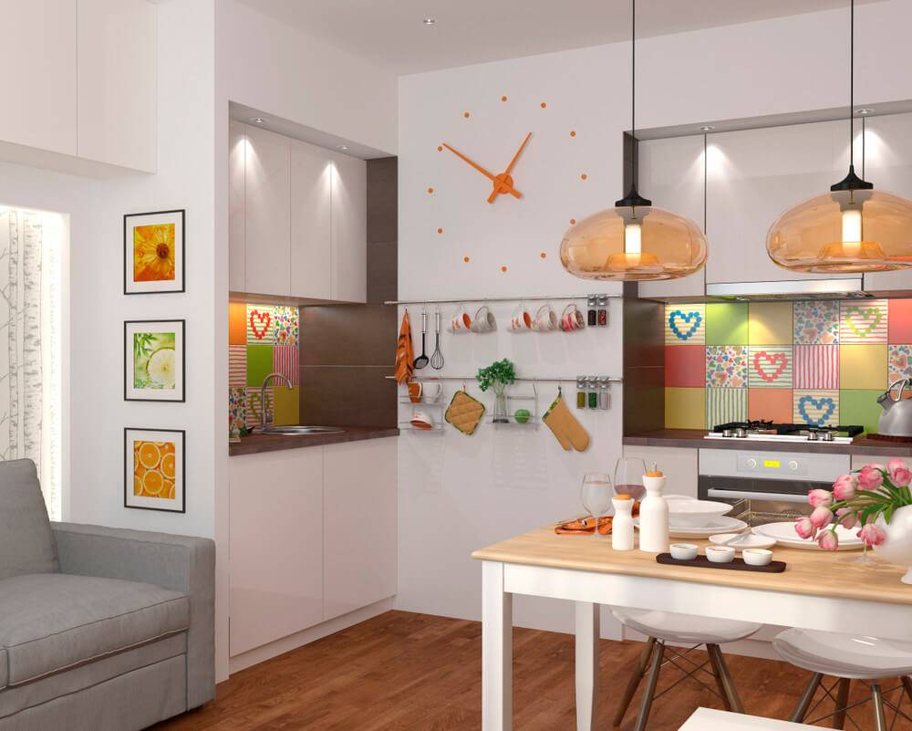 Придерживаться светлых тонов, желательно с темными вкраплениями — такое решение максимально маскирует разводы, пятна и прочие неприятности, что на кухне будет очень кстати.