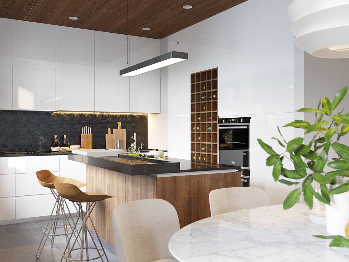 Использовать гладких поверхностей в зонах, где ведется активное приготовление пищи. При этом стоит избегать и слишком скользкого покрытия, например, на полу. Постелить только одно напольное покрытие на кухне. Если это плитка, то под нее установить систему «теплый пол» (исключая зону гарнитура), которая не даст ногам замерзнуть и сделает помещение уютнее. Если же выбор за ламинатом, то надо выбирать водостойкие варианты высокого класса износоустойчивости — 32 или 33. Затирку лучше выбирать на несколько тонов темнее самой плитки. Если фартук отделан популярным белым кабанчиком, то швы можно сделать темно-серыми или даже черными — такое решение будет смотреться очень эффектно