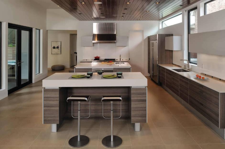 Потолок кухни из ламината можно использовать как элемент зонирования. Один из вариантов – отделка части стены и потолка одинаковыми панелями., чтобы получилась буква «Г». Этот прием можно использовать для выделения обеденной зоны или уголка для отдыха.
