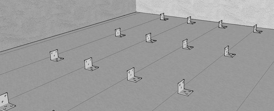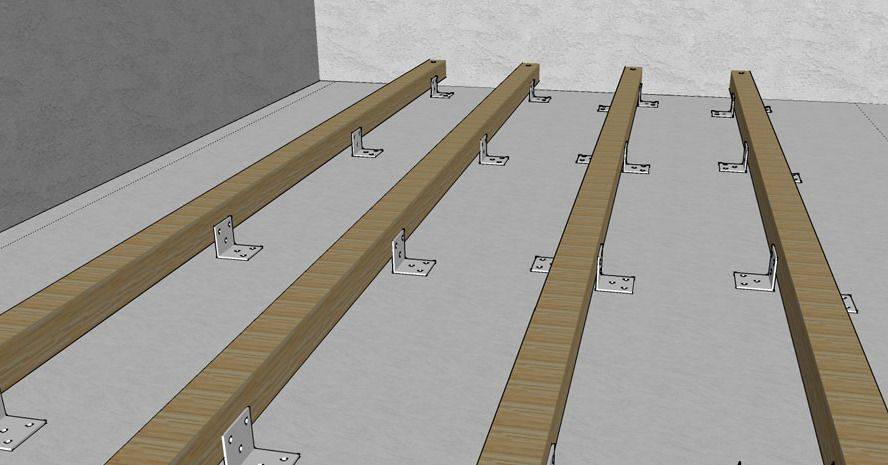 - монтируются лаги. Сделать это можно несколькими способами: с помощью П-образного профиля; на шпильки; на обрешетку. Лаги крепятся на расстоянии 2-3 см от стены и шагом 50-60 см между собой. Подробности крепления лаг можно посмотреть в материале «Утепление пола на балконе»;