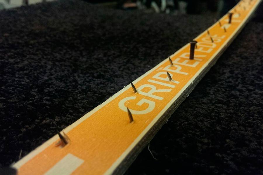 Грипперы крепятся к полу по периметру комнаты. Для этого используются нижние острия, которые вбиваются в основание. Полотно укладывают на пол одной стороной плотно к стене, обеспечивая зацепление края на острия. Затем покрытие раскатывают и крепят к противоположной планке с натяжением, используя для этого специальный валик.