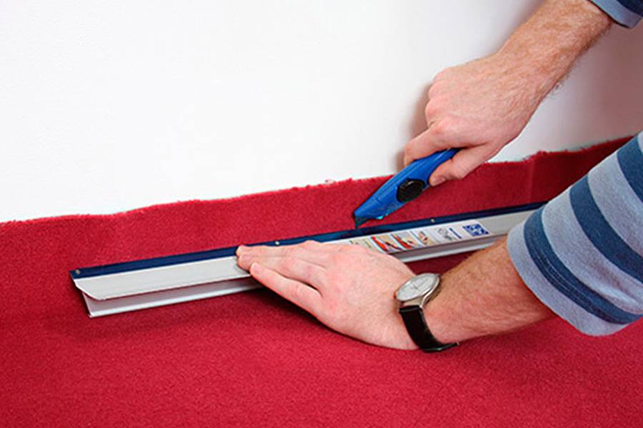 Когда покрытие выдержано, края подрезают по форме пола. Здесь важна точность и аккуратность. Удобнее всего действовать роликовым ножом — его вдавливают в угол и прорезают полотно. Когда все края оформлены, их прижимают плинтусами. Это позволяет лучше зафиксировать ковролин, делает покрытие привлекательнее и аккуратнее.