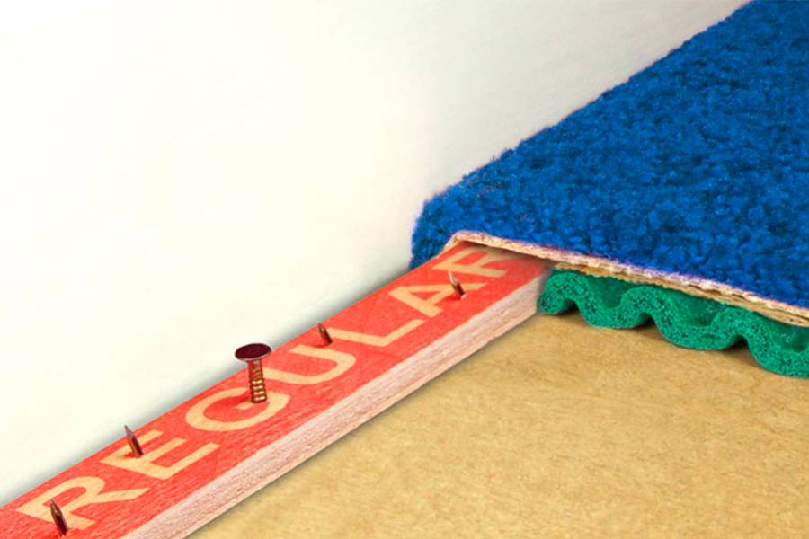 Тем же способом ковролин крепят в поперечном направлении. Когда полотно установлено, по периметру крепят широкий плинтус, прикрывающий бугорок от реек под ковролином.