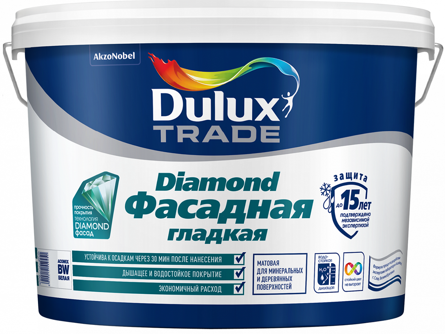 Этот состав отечественного производства считается профессиональным, поэтому и характеристики у него на высшем уровне. Краска изготовлена на латексной основе, применяется для фасадной отделки цокольных этажей, стен и прочего. Обладает необходимой влагостойкостью и паропроницаемостью. Готовое покрытие служит порядка 10 лет. На протяжении этого времени цвет сохраняется независимо от интенсивности и частоты погодных явлений.