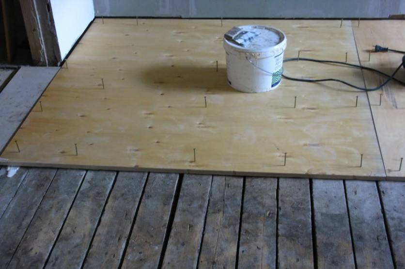 - Если имеют место перепады выше 0,2 см, ровность достигается применением фанеры. Ее кладут на бетон и фиксируют дюбелями. Специалисты рекомендуют перед монтажом выполнить гидроизоляцию паронепроницаемой пленкой. Подобная операция дает возможность смело отказаться от влагоизоляции и ограничиться монтажом подложки.