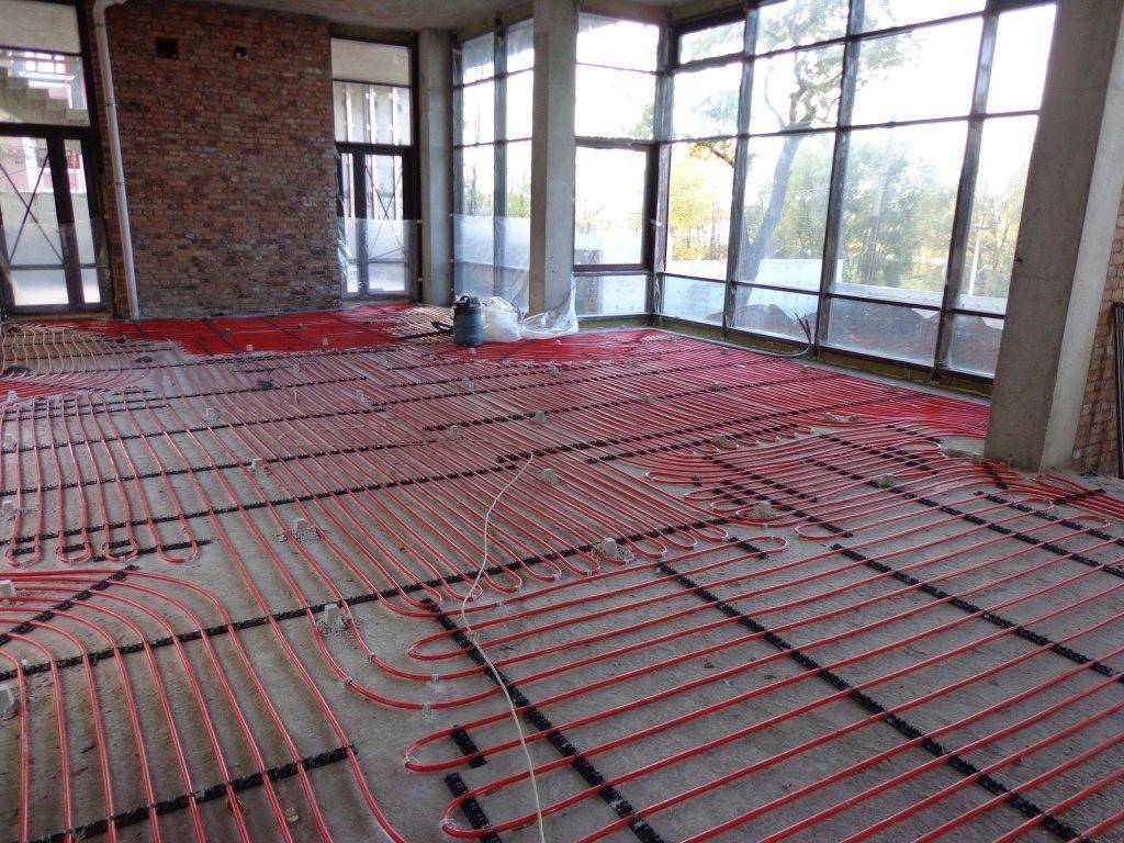 Уложенные трубы подключают к коллектору и источнику горячей воды, после чего производят проверку всей системы полы под давлением. Проверяют нагревание всех труб и отсутствие течей. После опрессовки системы устанавливают маяки и заливают песчано-цементную стяжку поверх труб.