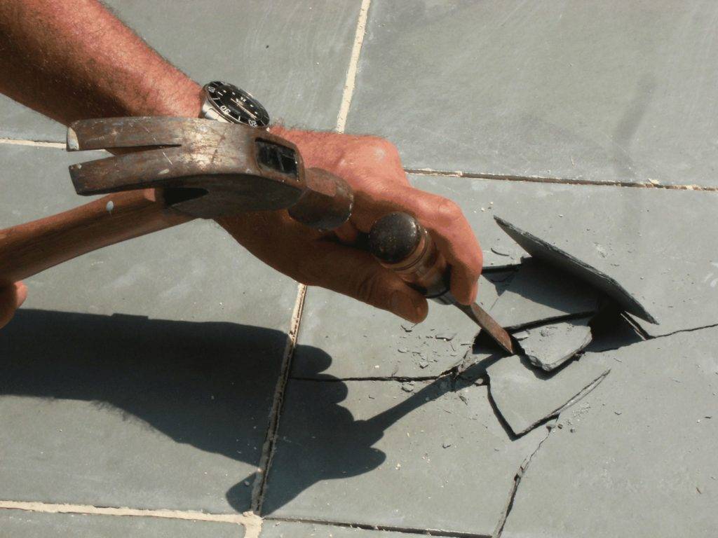 Бывают ситуации, когда на фоне благополучной общей поверхности одна или несколько плиток оказываются растрескавшимися или держаться недостаточно прочно. В этом случае их целесообразнее удалить, чтобы не подвергать риску прочность вновь устроенной облицовки. Ненадежные элементы отслужившей облицовки необходимо аккуратно разрушить и удалить так, чтобы не повредить соседние плитки. Образовавшиеся гнезда выравнивают заподлицо с общей плиточной поверхностью, заполнив углубление плиточным клеем или обычным цементно-песчаным раствором. Использовать для подобных целей смеси на основе гипса не рекомендуется, — они не влагостойкие и прочность таких растворов не соответствует нагрузкам на напольную поверхность.
