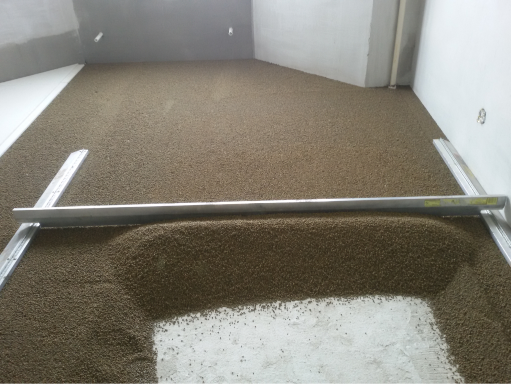 - Насыпать наполнитель. По уровню он должен быть чуть выше установленных маяков.