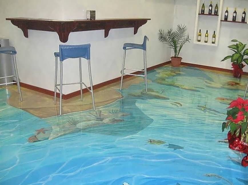 - Наливные полы, служащие финишной отделкой поверхности. Они изготовлены на основе эпоксидной смолы, полиуретана или метилметакрилата. В состав таких полов входят красители, благодаря которым гладкая поверхность не нуждается в дополнительном декорировании. Под прозрачные наливные полы для декора укладывают специальные рисунки, которые образуют мозаику или картину с 3D-эффектом. Использовать такой наливной пол в качестве основания под плитку — это кощунство. Тем более стоимость этой линейки наливного пола очень высока. Однако в случае утраты декоративных качеств (при устаревании, отслаивании фрагментов из-за несоблюдения технологии монтажа) такой пол можно использовать для облицовки плиткой. Подготовка основания заключается в удалении отслоившихся фрагментов и повышении адгезивных качеств (грунтовкой). Впрочем, если есть необходимость, то на вопрос: «Лить наливной пол на наливной пол можно ли (для дополнительного выравнивания или поднимания уровня пола)?» — ответ положительный.