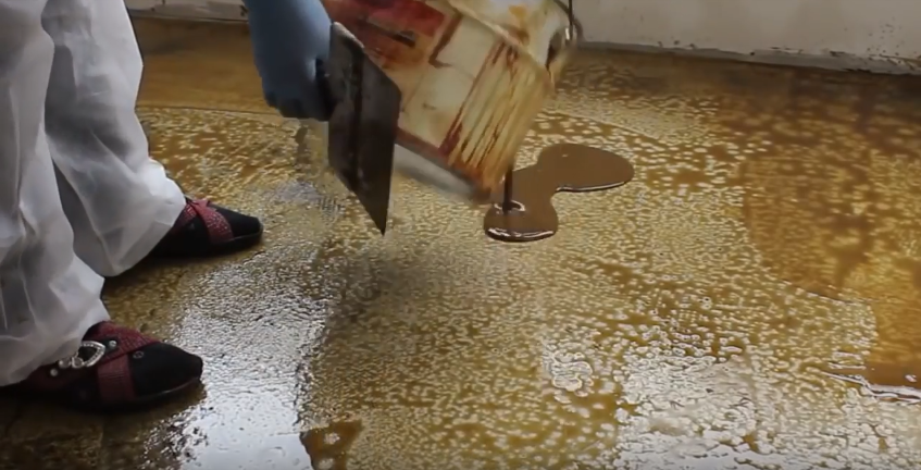 Заливка базовой полимерной стяжки начинается с приготовления раствора. Здесь нужно учитывать, что через 15-40 минут после замеса раствор полимеризуется и станет твердым. Если за это время не успеть разлить и выровнять его, то нужно будет готовить новую сумму для покупки смеси.