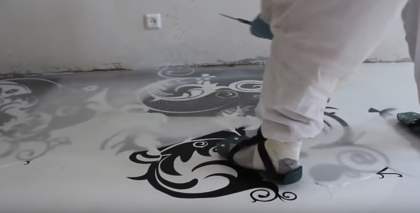Создание покрытия с рисунком происходит следующим образом. Сначала производят основные подготовительные действия – очищение покрытия от загрязнений. После этого поверхность пола грунтуют двухкомпонентным составом, предварительно очистив ее от пыли. Грунтовку необходимо наносить быстро. Качественная обработка станет залогом хорошей адгезии основы с декоративным полом. Наносят состав при помощи валика с коротким ворсом. Покрытие оставляют высыхать в течение суток.
