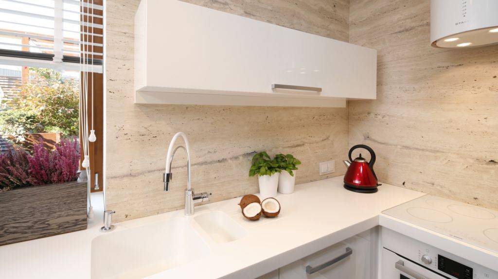 Интересным решением являются водостойкие обои для плитки или шпона. Однако не деревянные — они не подходит для стены между нижним и верхним шкафами на кухне, поскольку они не очень устойчива к влаге. Тем не менее, каменный шпон, который сделан из кристаллического сланца, соединенного с полиэфирной смолой будет идеален.