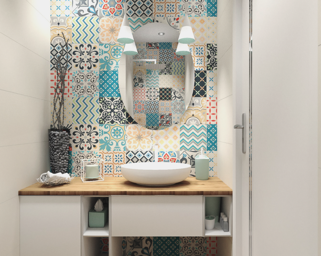 Чтобы помещение не казалось чересчур стерильным, добавь в отделку декоративные вставки, например – мозаичное панно на одной из стен, выполненное в яркой палитре или плиточный узор. Хорошими помощниками станут и яркие виниловые наклейки, которыми нередко украшают стену над ванной или в душевой.