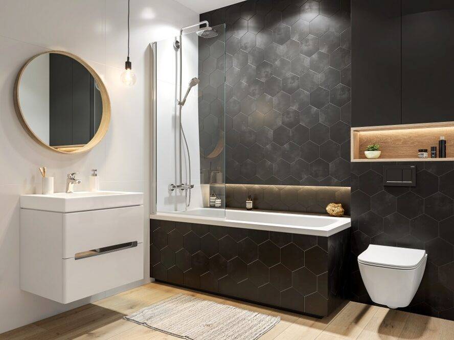 Чтобы ванна не выглядела операционной сделайте акцент из контрастных оттенков