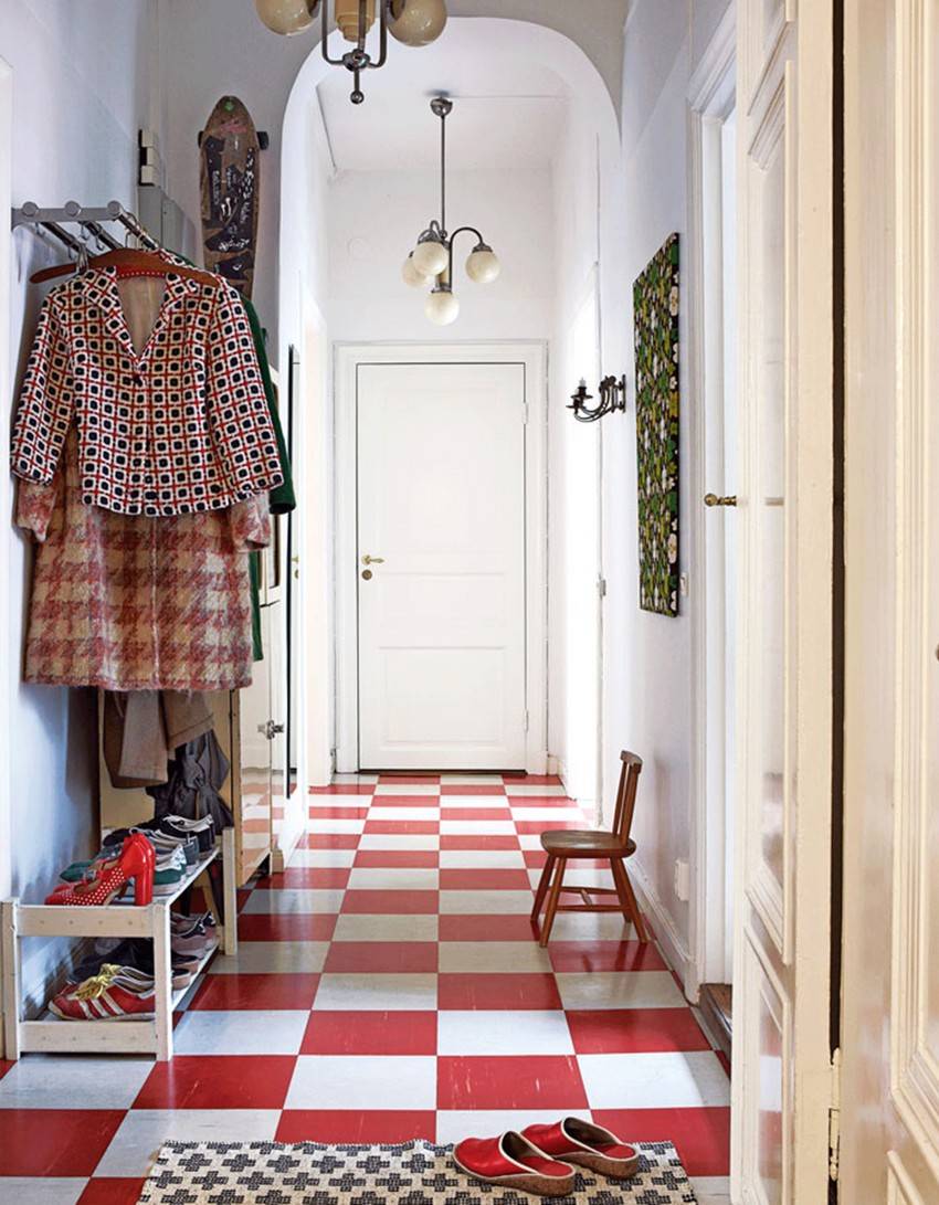 Кажется, что площадь помещения стала больше, если плитку положить не квадратами, а по диагонали. Это относится и к одноцветному полу, и к цветному. Учтите, что черно-белая «шахматка» подходит только для просторной прихожей. В небольшом коридоре, выполняющем ту же функцию, такая выкладка визуально сузит стены.