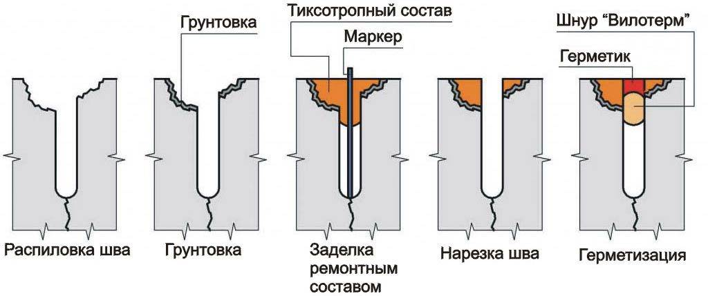 Подготовив трещину и очистив ее, нужно нанести глубоко проникающую грунтовку. Разрезы трещин нужно заполнить тиксотропом и поместить внутрь металлические скобы.