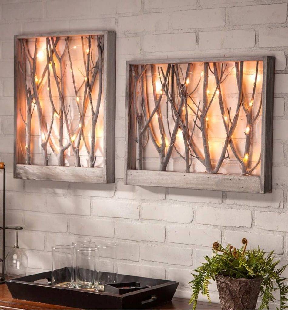 Если у вас имеется печь или камин, то всегда нужны сухие дрова. Вы можете их разместить прямо дома, заодно декорировать стену. Подойдут ветки различной толщины, которые нужно ровненько сложить на полочках.