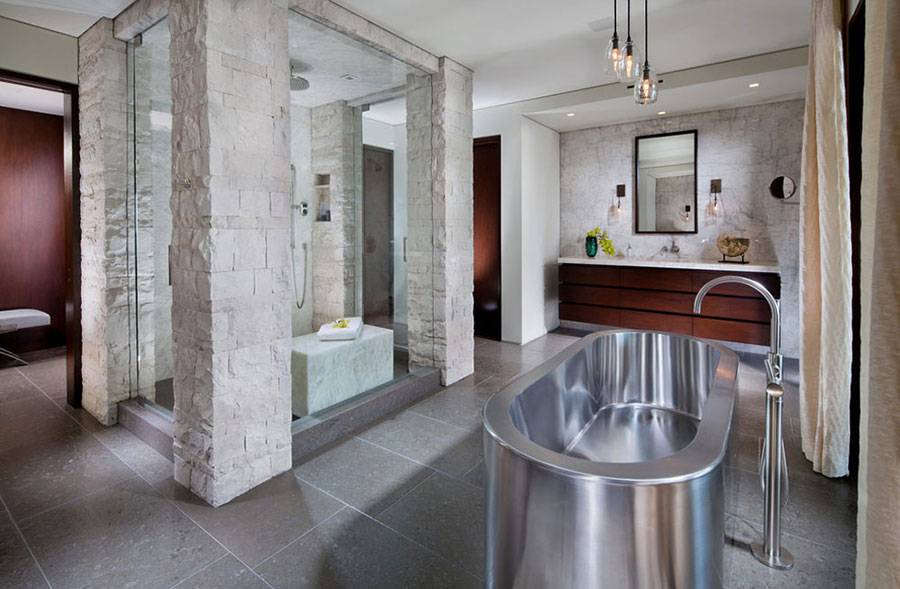 В ванных, выдержанных в современных стилях, камню также найдется применение. И это будет одна из самых впечатляющих декораций.