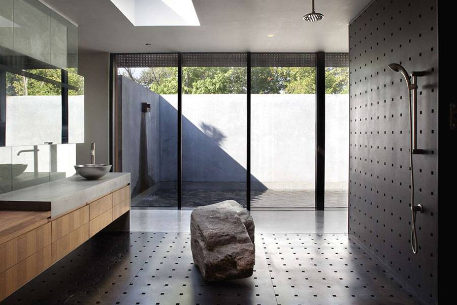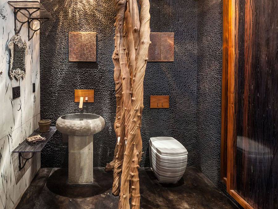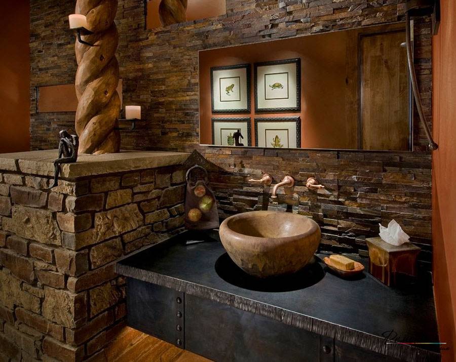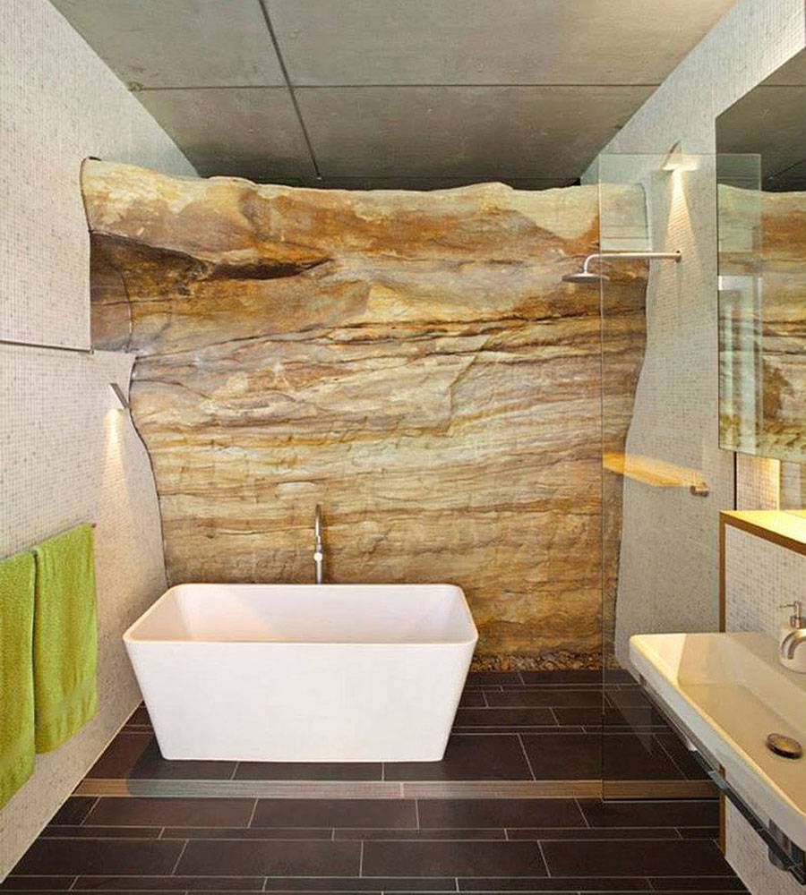 Неожиданной и акцентной деталью интерьера станет простой камень, расположенный посреди ванной, который автоматически превратится в скульптурный элемент. Стоит заметить, что остальной декор не должен быть ярким и вызывающим.