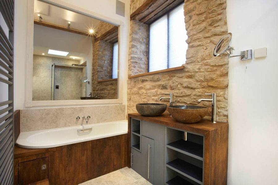 Для того чтобы придать объема стенам и пол сделать максимально комфортным и безопасным, смело используйте в оформлении ванной комнаты камень. Этот материал также идеален для изготовления раковин и ванных. По отдельности или в тандеме они существенно преображают внешний вид помещения, формируя в нем особую атмосферу.
