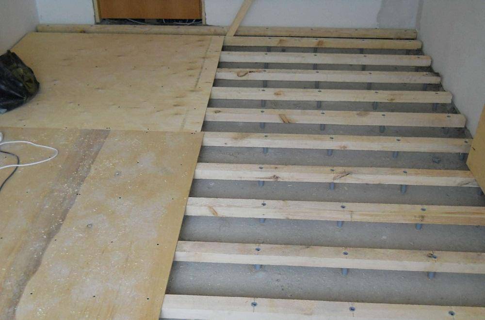 Здесь вариантов будет поменьше, но они менее трудозатратны, их всего два: закрепить на деревянном основании лаги и настелить на них доски или фанеру, либо накрыть основание без лаг. Первый способ предпочтительнее, когда ремонт пола в хрущевке сопровождается тепло- или шумоизоляцией пола своими руками.