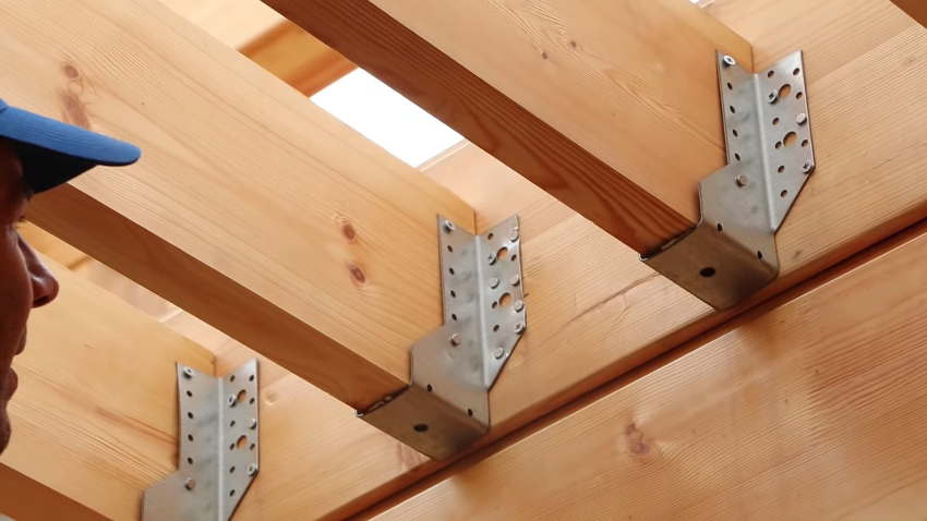 Также балки можно закрепить на стене с помощью опор из металла — стальных уголков, хомутов, кронштейнов. Они соединяются со стенами и балками саморезами или шурупами. Данный вариант крепления является наиболее быстрым и технологичным, однако менее надежным, чем при заведении балок в пазы стен.