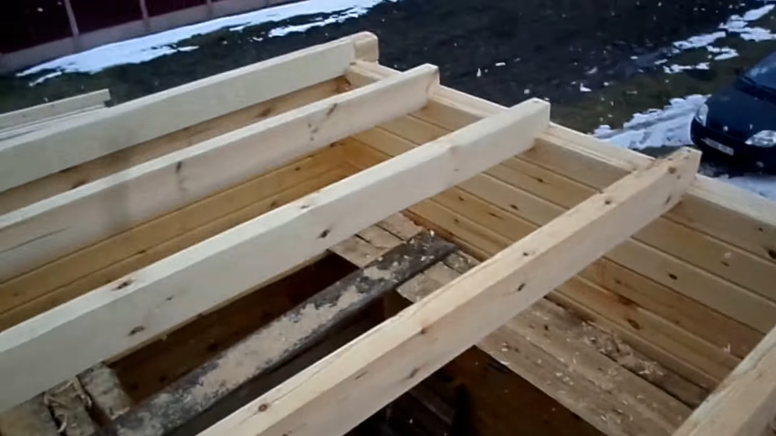 - К балкам либо крепим черепные бруски 50х50 см, на которые укладываем черновой настил из досок, либо обустраиваем простой накат из деревянных плит. Он должен быть достаточно прочным, чтобы выдерживать массу утеплителя без деформаций.