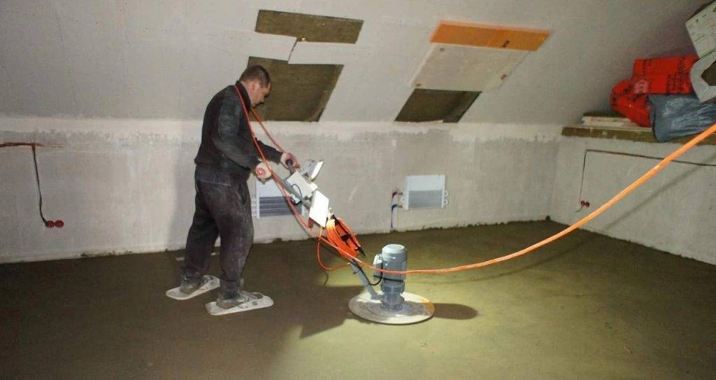Через пару часов после разравнивания, стяжку затирают и шлифуют, проводя по ней диском шлифовальной машины. Дополнительно увлажнять поверхность не требуется. Шлифовка сглаживает поверхность, устраняет незначительные неровности: ямки и бугры.