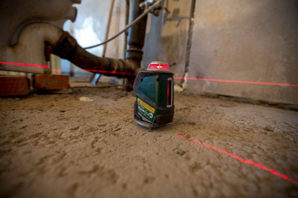 С помощью лазерного уровня по всему периметру помещения выставляют нулевой уровень – горизонталь, проходящую через самую высокую точку пола. От нее отмеряют вверх расчетную толщину стяжки и получают новую горизонталь – уровень стяжки.
