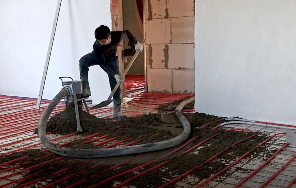 Когда в помещение подано расчётное количество материала, монтажники начинают его распределение по поверхности перекрытия до достижения нанесённой на стене отметки.