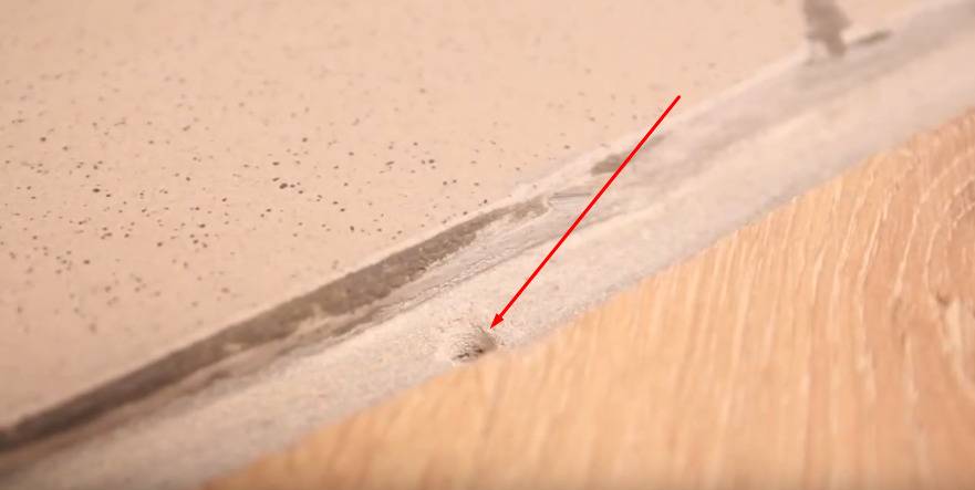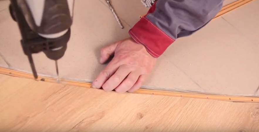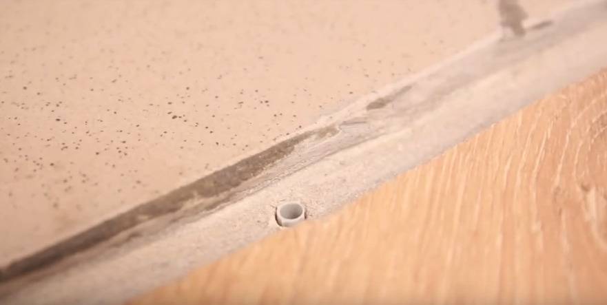 Если используется скрытое крепление, сначала изготавливают отверстия и вставляют в них дюбели. Затем в паз с изнаночной стороны вставляют саморезы. Их можно передвигать вдоль оси порожка. Шурупы совмещают с гнездами и через деревянный брусок аккуратно забивают в них. В результате получается порожек без видимых крепежных элементов, аккуратный и практичный.