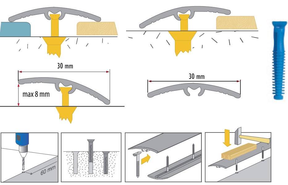 Монтаж порожка зависит от его конструкции и типа профиля. Наиболее распространенные образцы, представляющие собой слегка выпуклые полосы из металла или пластика, крепятся к полу с помощью шурупов. Их прикладывают к покрытию, отмечают на основании точки установки дюбелей и сверлят гнезда. Затем вставляют дюбели, снова прикладывают порожек и прочно фиксируют его на полу. Шляпки шурупов рекомендуется закрасить — так можно скрыть их, хотя бы частично.