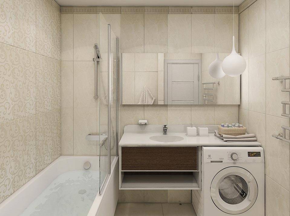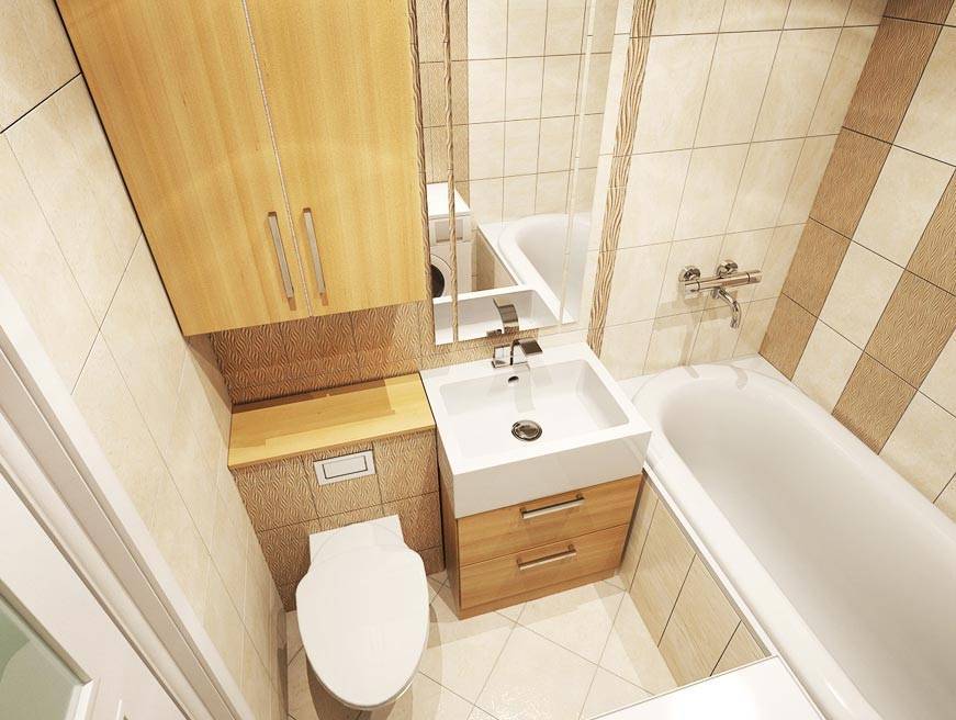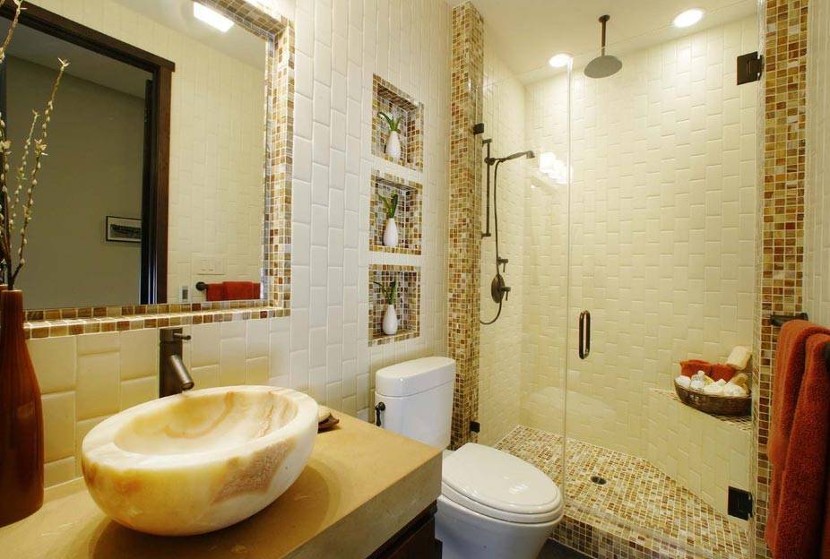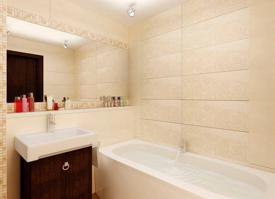 При реализации проекта можно воспользоваться готовыми идеями дизайна интерьера. Оригинально выглядит комбинирование 3 типов плит при отделке поверхностей, используются блоки прямоугольные средних габаритов, квадратные элементы и мозаичная кладка. Оттенки должны соответствовать выбранному стилю и тональности гаммы. При реализации схем необходимо учитывать комплектацию ванной.