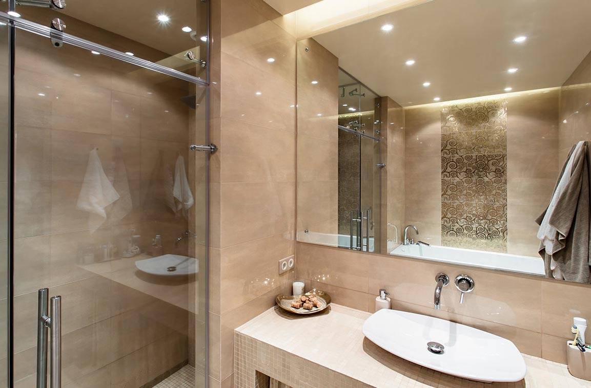- Для компактного помещения предпочтительна глянцевая плитка — она зрительно делает его более просторным. В большой ванной можно уложить матовую облицовку: в отличие от глянца, на ней не видны капли, разводы после влажной уборки, следы от касания пальцами.