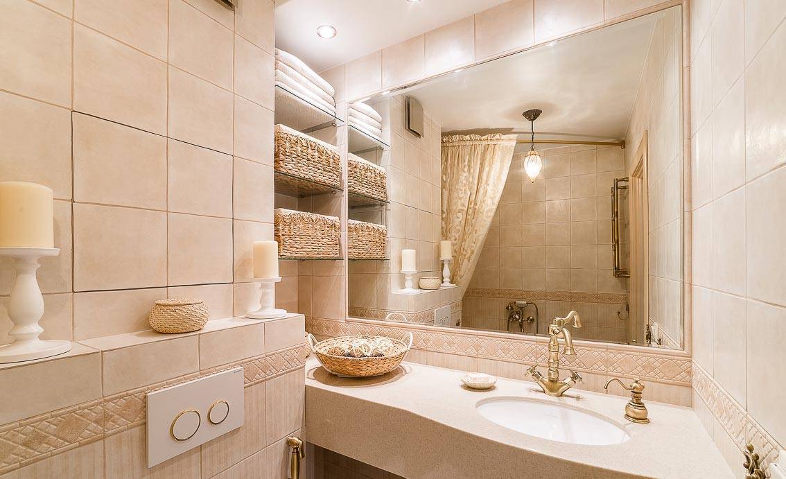 - В просторной ванной гармонично смотрится и мелкая, и крупная плитка.