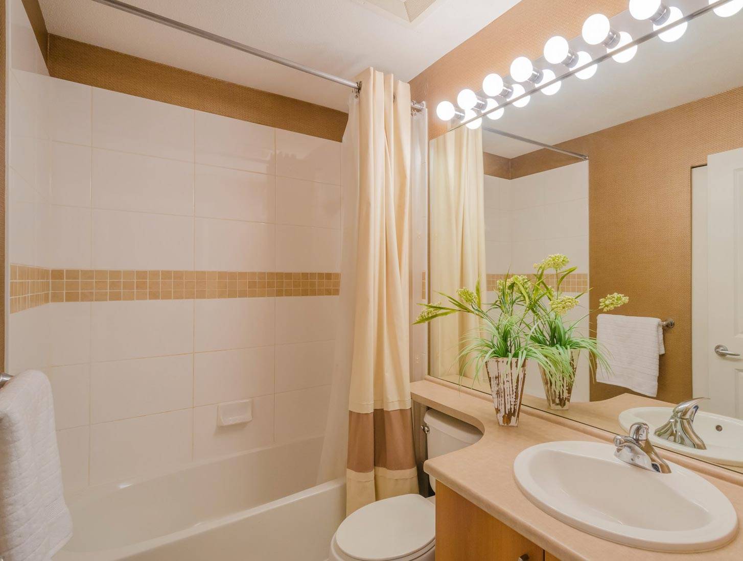 Чтобы сэкономить на покупке кафеля и визуально расширить пространство, значительную часть стены можно отвести под зеркало с подсветкой.