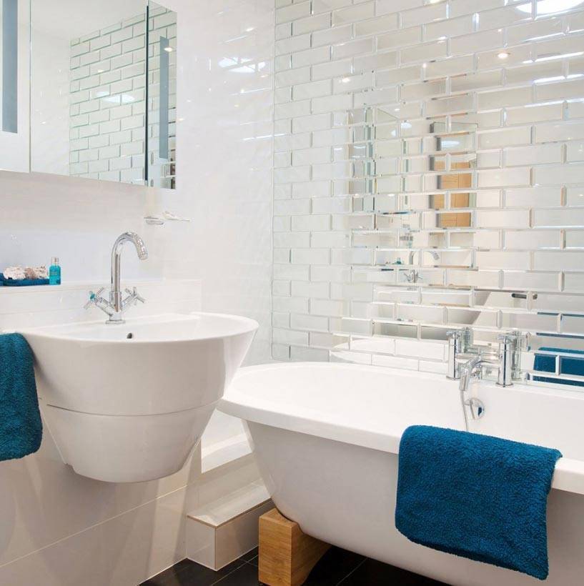 Для визуального расширения комнаты с ванной в отделке одной стены применяются плиты с глянцевыми поверхностями, зеркальная мозаика, крупные зеркала. Возможно оформление плоскости художественной мозаичной плиткой из стекла либо смальты.