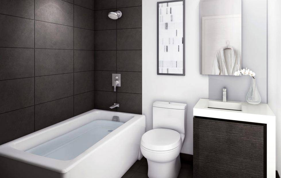 Лучше всего использовать темную матовую напольную плитку. Если вы положите глянцевую плитку на пол, он будет скользкой, и со временем на ней появятся потёртости. К ней должна прилегать тёмная настенная плитка. Это будет красиво и гармонично, так как они будут подобранными из одной коллекции, а также практично – на тёмном фоне будет меньше видно грязных пятен. Оптимальнее всего тёмный фон делать чуть выше ванной минимум на 7 см, чтобы не получить узкой полоски после установки керамического плинтуса. Если вы не знаете точной высоты, то лучше положить 1 запасной ряд.