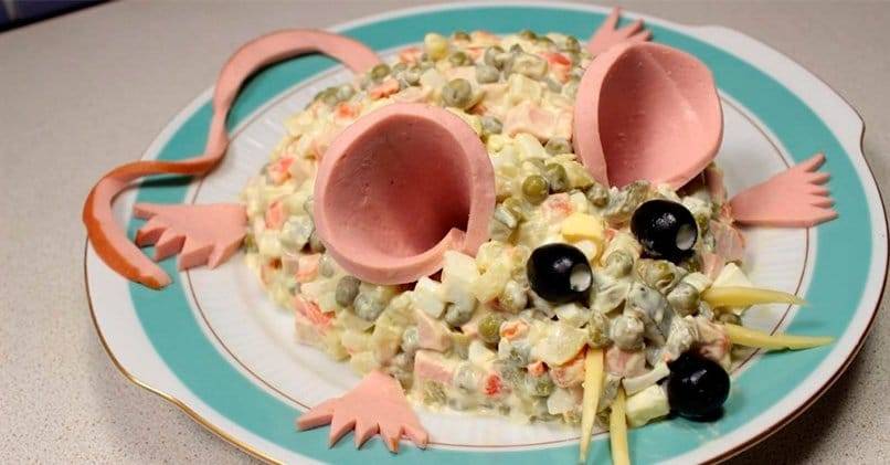 По своей задумке такой салатик очень веселенький, потому что само оформление выполнено в виде игрушки. А вот какой, увидите по ходу дела. Я надеюсь, что этот шарик принесет вам удачу! Поймайте ее за хвост на целый предстоящий год.