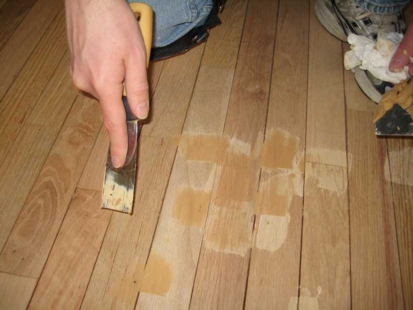 После затвердевания место ремонта зачищается мелкой шкуркой и покрывается паркетным лаком. Если цвет подобран верно, то место ремонта будет незаметно.