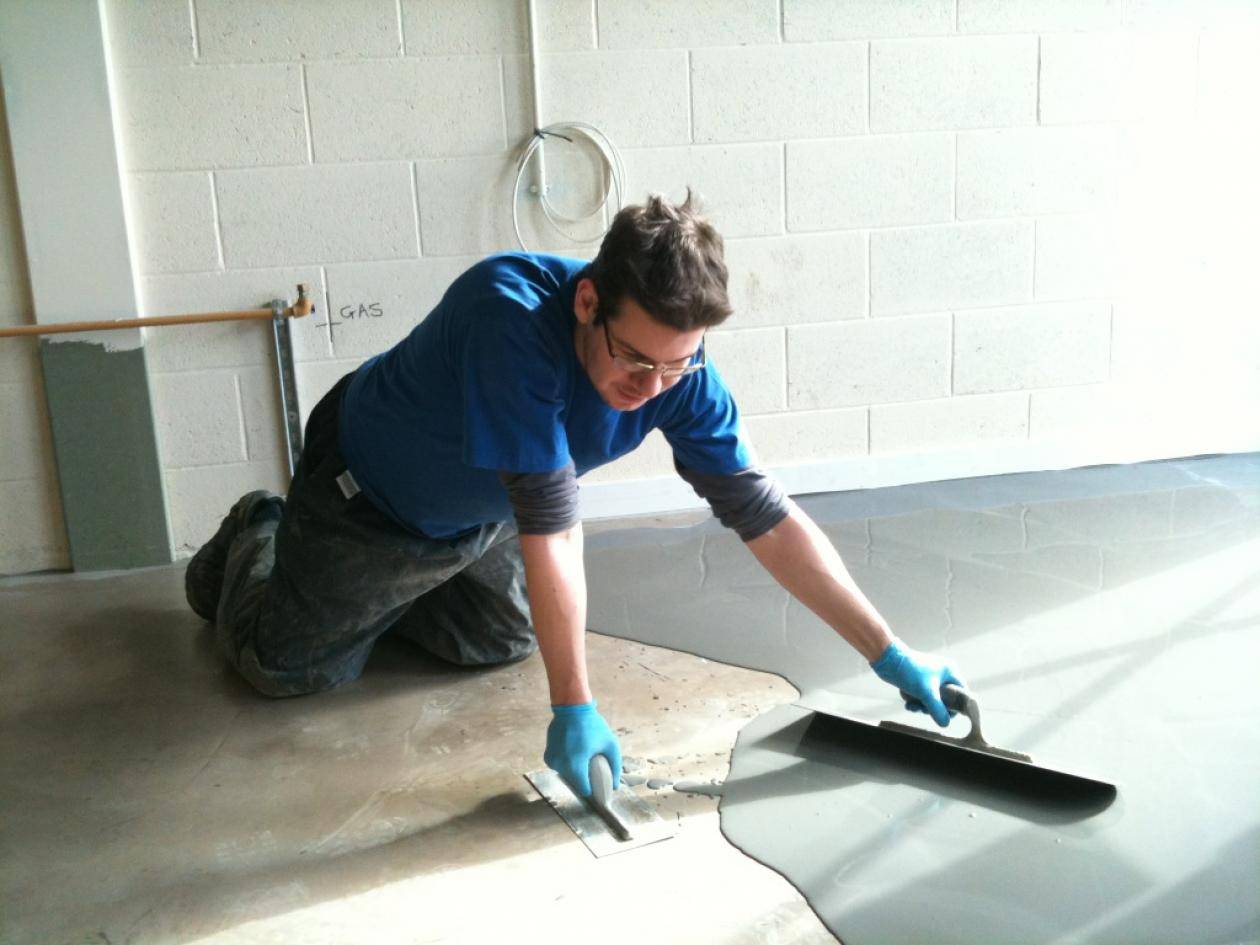 Нанесение самовыравнивающихся смесей выполняется по той же технологии, но при этом разравнивать раствор шпателем не нужно – он сам растекается по полу.
