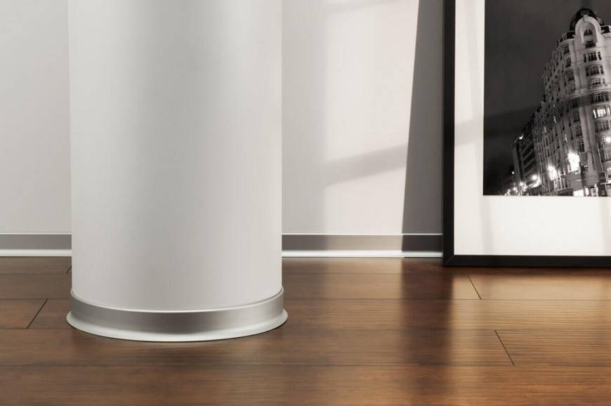 Некоторые гибкие плинтуса свернуты в рулоны. Проблем с гибкостью и приданием нужного радиуса нет. Их можно согнуть в кольцо небольшого диаметра. Зато есть проблемы с подбором цвета или высоты. Если колонны стоят отдельно, то с этим проще. Задача — более-менее попасть в цвет и «формат» плинтусов. Но если это только скругление или полуколонна? Красиво состыковать два разных по высоте (а часто и по материалу) плинтуса задача нетривиальная и не у всех получается.