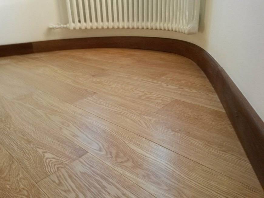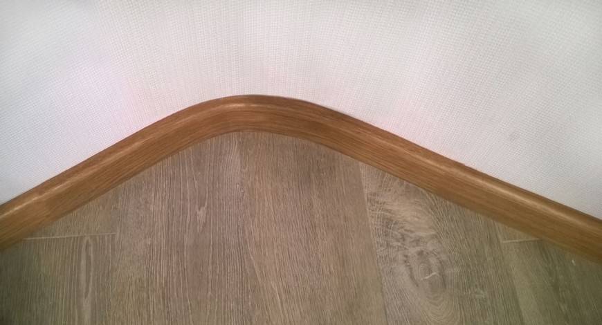 Гибкий напольный плинтус из винила может гнуться с любым радиусом. Это лента из пластика, разделенная на две части продольной канавкой. По этой канавке и сгибают ее