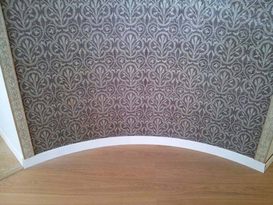 Оформление криволинейных стен, круглых колонн и полуколонн часто становится проблемой. Стены в эркере тоже обычно круглые. Некоторые делают скругленные углы. Все это смотрится красиво и придает неповторимость дому, но в отделке возникают проблемы. Одна из них — в подборе плинтусов. Они обычно в виде планок, причем довольно жестких. Возникает вопрос — как оформить криволинейные поверхности?