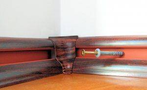 - зафиксировать плинтус саморезами, шляпки которых скрыть акриловой шпаклевкой.